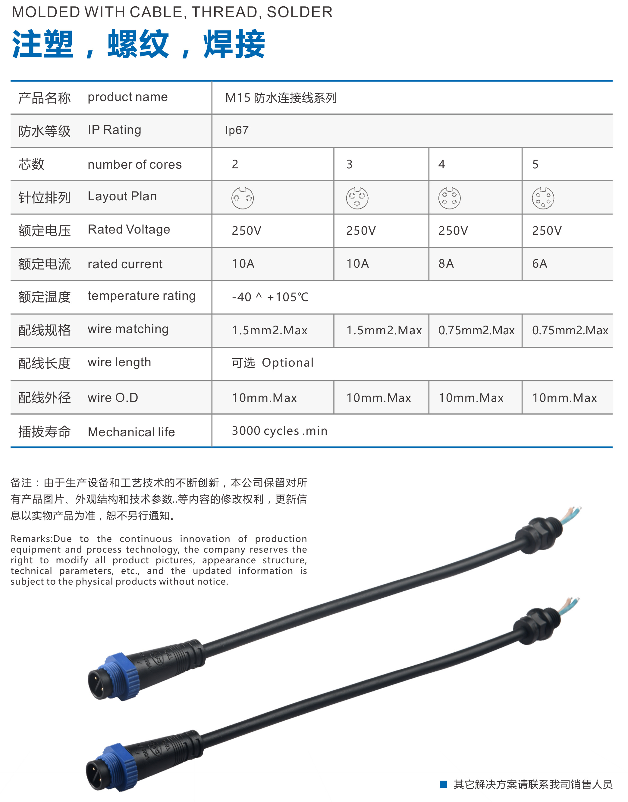 TAWANG以“科技创新,优质高效,顾客至上,持续改进”的质量方针,关注顾客需要,满足顾客要求,不断追求新的发展。在质量管制方面,建立以制程管控为基础,预防为主的质量管控模式。满足不同行业、不同应用、不同需求的使用者要求,成为电子、通讯及高科技企业的理想合作伙伴,永远是TAWANG孜孜以求的目标和不断超越的动力源泉!这一款M15 直头螺纹式公母头系列芯数有2-5芯可选,满足客户多种需求!TAWANG M15 直头螺纹式公母头系列广泛用于户外防水工程,LED路灯,随道灯,地铁、桥梁,城市亮化照明工程,家电,嗳风机,电暖器,等家电,电动工具,户外LED灯,户外灯具,水泵,地埋灯,水低照明等。橡胶线较软,弹性好,耐高温,耐油,耐寒,承受外力强度高,具有很高的耐候性,尤其适合于户外工程,接触油污或环境恶劣的场所,寿命长,耐老化。TAWANG的M15 直头螺纹式公母头系列具有耐寒、耐高温、防水、易安装、接触性好,性价比高等优点。TAWANG的M15 直头螺纹式公母头系列安全可靠、质量保障!2-3芯线已经获得UL、TUV、CQC的认证!TAWANG欢迎您的咨询~